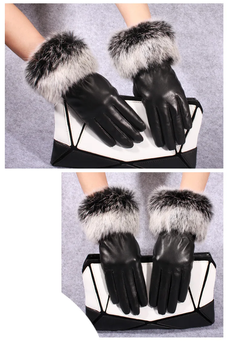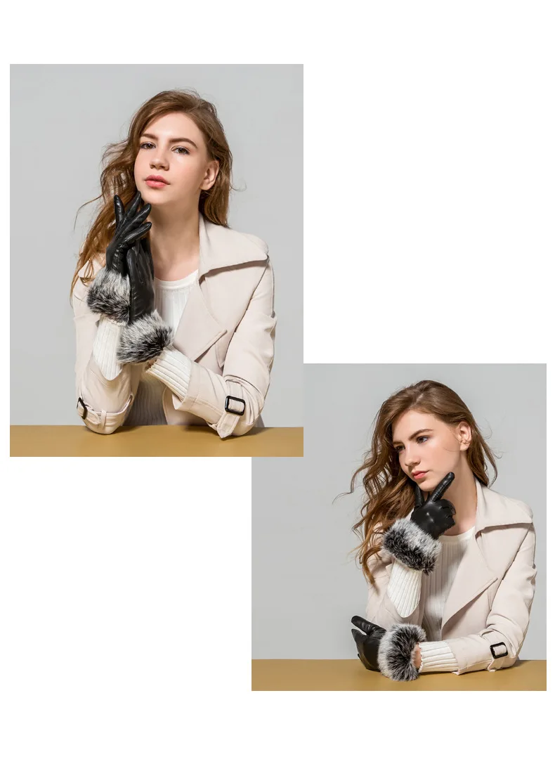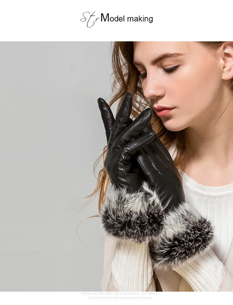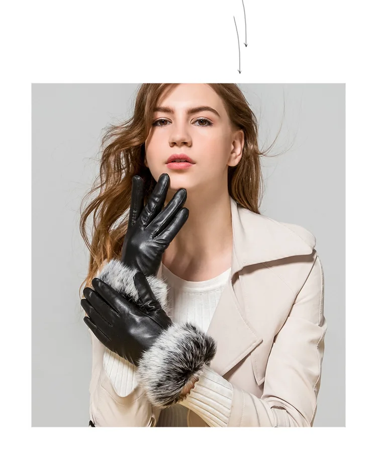 Genuine Sheep Leather Fashion Gloves for Women Winter Cashmere Warm Big Rabbit Hair